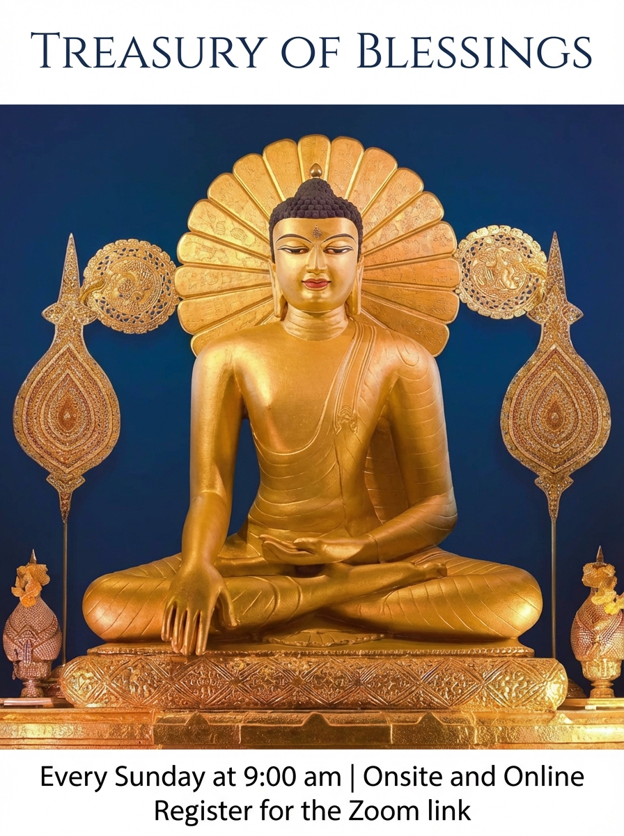 Join our weekly practice of the Treasury of Blessings, the Shakyamuni Buddha sadhana composed by Mipham Rinpoche. This essential practice emphasizes visualization of Shakyamuni Buddha, recitation of his dharani, and meditation to connect directly with his awakened wisdom mind.