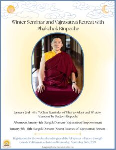 Rangjung Yeshe Gomde California is honored to welcome our revered lineage master, Phakchok Rinpoche, for our annual Winter Seminar and Vajrasattva Retreat. Please note this registration is for those who are attending the teachings with Phakchok Rinpoche from January 2nd-4th. If you would like to join for the full program, please register at this link. Our seminar will focus on “A Clear Reminder of What to Adopt and What to Abandon,” Kyabjé Dudjom Rinpoche’s masterful and heartfelt instructions on Vajrayana practice. Following this essential teaching, Rinpoche will bestow the Sangtik Dorsem empowerment on Sunday afternoon, opening a gateway into the…